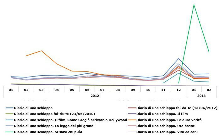 Pure nel caso della fortunata serie umoristica per ragazzi di Jeff Kinney Il diario di una schiappa (pubblicata in Italia dall’editrice Il Castoro a partire dal 2008), si può notare l’effetto traino sulle vendite provocato dalle nuove uscite. In particolare, la pubblicazione del volume-novità di novembre Diario di una schiappa. Il film. Come Greg coincide con il picco multiplo di tutti i volumi della serie nel periodo natalizio tra novembre e dicembre, in modo simile a quanto avvenuto per la serie di Hunger games (Tab. 4).