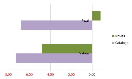 Si conferma il decremento, relativamente ai prodotti, dei libri di catalogo (-7,28% a valore) rispetto alle novità (-4,81% a valore).