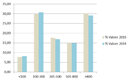 Uno sguardo alle dimensioni evidenzia il sorpasso della fascia >800mq in termini di assorbimento a valore rispetto alla fascia 100-300 mq.