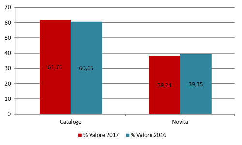 Cresce il peso del Catalogo sulle Novità, che passa da 60,65% a 61,76%.
